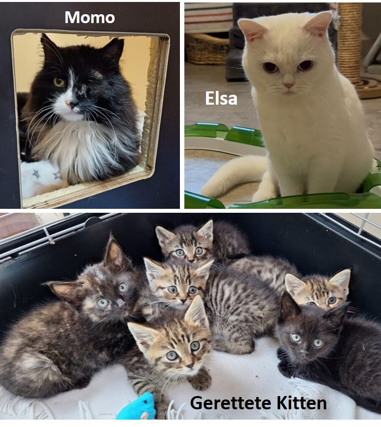 Aber es gab auch Lichtblicke: dieser kleine Kämpfer hat es geschafft und konnte gemeinsam mit seiner Freundin Finchen viele Wochen später in ein liebevolles Zuhause ziehen. Elsa, neun Monate jung, taub, mit Hüftproblemen und verletzter Pfote, stammte aus einer großen Sicherstellung unsererseits mit 44 Katzen. Eine Operation war unausweichlich und so bekam sie eine Hüftkopfresektion und musste 6 Wochen Boxenruhe einhalten. Mittlerweile hat sich Elsa gut erholt und konnte in ein schönes Zuhause vermittelt werden. Derweil brauchte eine junge Mutterkatze mit sechs Babysdringend Hilfe: Sie war so geschwächt, dass sie ihre Kleinen nicht genug stillen konnte. So war wieder unsere Pflegestelle gefragt, die die Babys mit Fläschchen Tag und Nacht alle 2-3 Stunden fütterte. Auch andere, pflegeintensive Katzen forderten unsere volle Aufmerksamkeit – ein täglicher Kraftakt, den unser Team mit großem Einsatz und viel Herzblut leistete.