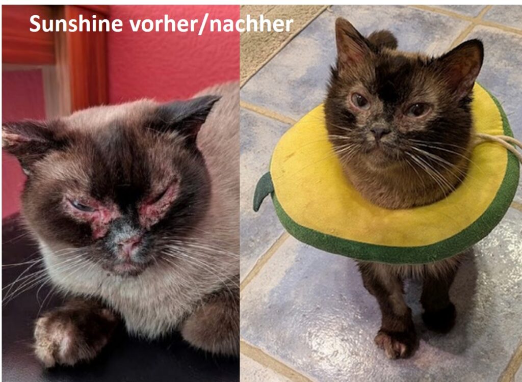 Sunshine war eine von ihnen: sie kam mit großen Wunden (Autoimmunerkrankung) am gesamten Körper zu uns und auch hier war die Behandlung sehr langwierig, aufwändig und vor allem kostenintensiv, aber Sunshine hielt mit uns tapfer durch und ihre Genesung schreitet langsam voran.