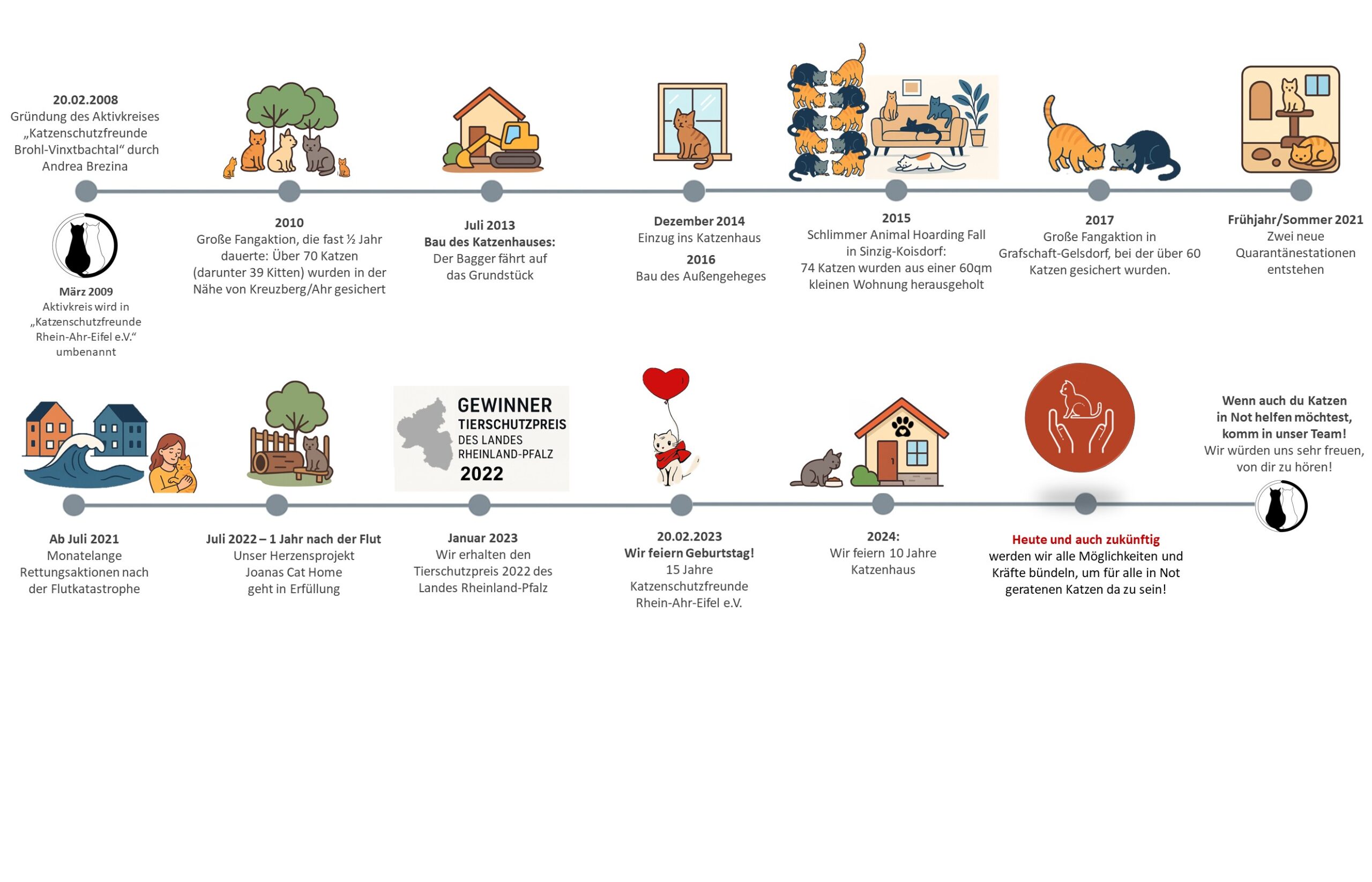 Unser Verein, damals noch Aktivkreis Katzenschutzfreunde BrohlVinxtbachtalwurde am 20.02.2008 durch Andrea Brezina ins Leben gerufen. Andrea hatte die Vision, effektiven Katzenschutz zu leisten, der gleichzeitig auch die Menschen bedenkt. Aus dem damalig gegründeten Aktivkreis wurde dann im März 2009 der Katzenschutzfreunde RheinAhrEifel e.V.“.